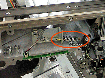Push the force gauge toward the center of the y-guide rail until the x-cable touches it. The force should read 10.5 ± 0.5 lbs. If it does not, proceed to the adjustment procedure.