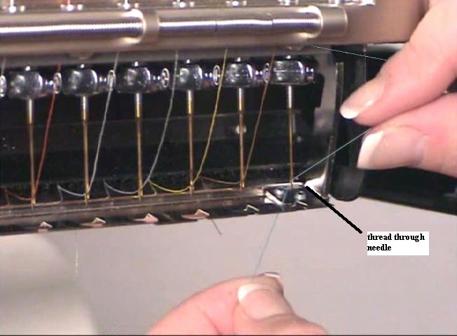 Route the thread straight down to the middle thread guides back, left hole, facing downward.