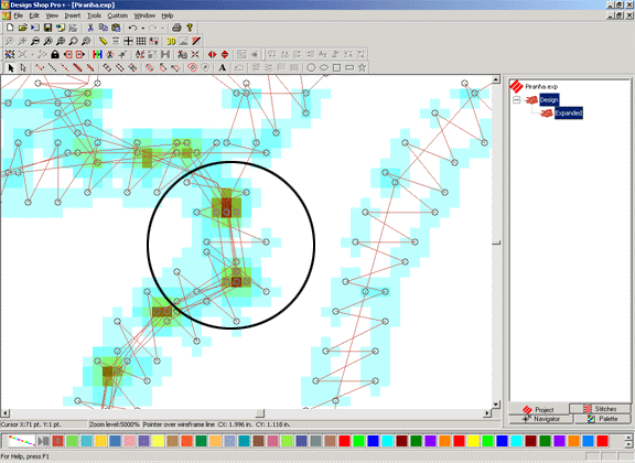 To use this tool, open a design, then select Tools->Filter->Stitch Proximity Plot. This plot will display areas that contain a large number of stitches in a small area. The image below displays a zoomed in view of a design. You can turn off the Stitch Proximity Plot by clicking on the Tools/Stitch Proximity Plot menu item.